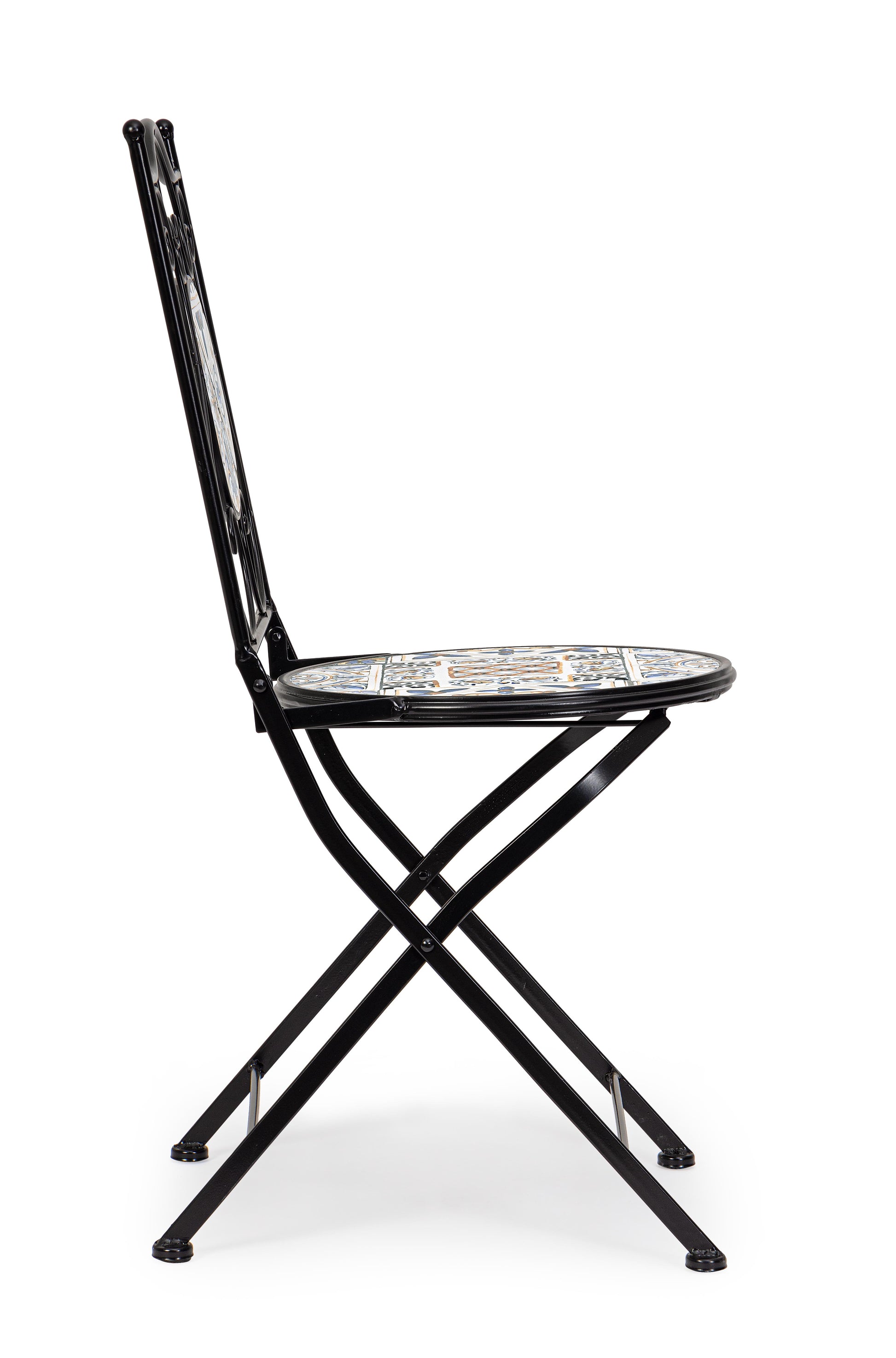 DettagliSTRUTTURA IN ACCIAIO TRATTATO PER L'ESTERNO (E-COATING) E VERNICIATO A POLVERE EPOSSIDICA. SEDUTA E SCHIENALE CON DECORO IN CERAMICA. PIEGHEVOLE.